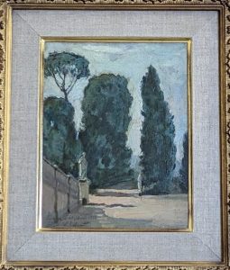 さて、ここまで書いて来て本稿は最後に落ちがある。表題の【小堀四郎 取っ掛かりの無かった幻の画家】は、当初【取っ掛かりの無い画家】としていた。それが脱稿に及んで【取っ掛かりの無かった画家】に変わったのである。理由は、小堀の実作を入手したから、だ。冒頭に触れた神保町のギャラリー内田を訪れた。かの小堀作品の去就を尋ねたところ、未だそこにstayしていたのである。オーナーの内田久さんが大事にして手放さなかったのだ。取っ掛かりが出来た。取っ掛かりが[無い]のは過去の話になった。今や幻ではない。初見の頃と違い小堀四郎について学んで幾分かの知識も得た。当該作品は油彩で2号板に描かれている。「S.Coborit」の署名だけでなくフランス語で「フィレンツェ 1933・2・10」と記されている。年譜に[1933年1月パリを出発しイタリア各地を旅行、ナポリから帰国の途につき6月帰国]とある通りだ。緑一色で捉えられた樹木に形態を把握しようとする意識を感じる一方で、大気と地面にはゆったりとした無心の写生がある。品格を備えた出来だ。この作品【フィレンツェ】は、小堀が1933年藤島の奨めにより上野(と名古屋の)松坂屋で開催した滞欧作品展(油彩183点)以来となる49年振りの個展、1982年3月ウイルデンスタイン東京(画廊)で展示された油彩35点(滞欧作13点、帰国後作22点)の1点である。