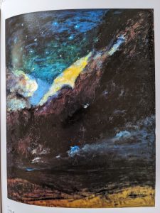 戦後は【高原の聖夜】1961を経て、晩年【無限静寂】1977、【浄寂】1980、【驚異の美】1987、等の連作に取り組んだ。上杜会展出品作 【無限静寂】三部作(100号)は築地カトリック聖堂の祭壇画となった。これらの作品には神秘の世界を感じる。画題からもそれが伝わる。風土の違い、宗教観の違いなどに因って表象の相違はあるものの、モチーフとなる空や大地の表情、壮大さが醸し出す悠久なる自然のイメージがフリードリヒ作品と重なって来る。主観的風景画と言える。